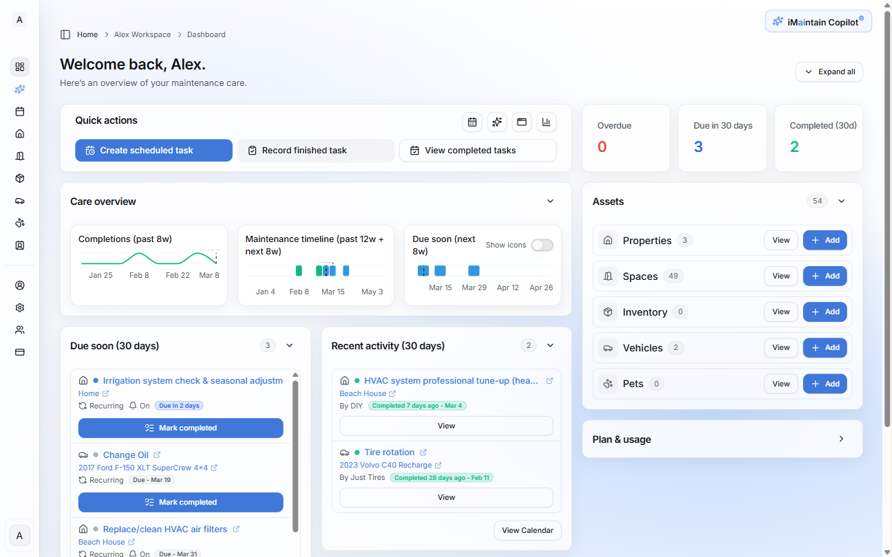 Most people track maintenance and important records across notes, emails, spreadsheets, and memory. iMaintain brings everything together into one structured workspace so your records, maintenance schedules, documents, and service history stay organized over time.