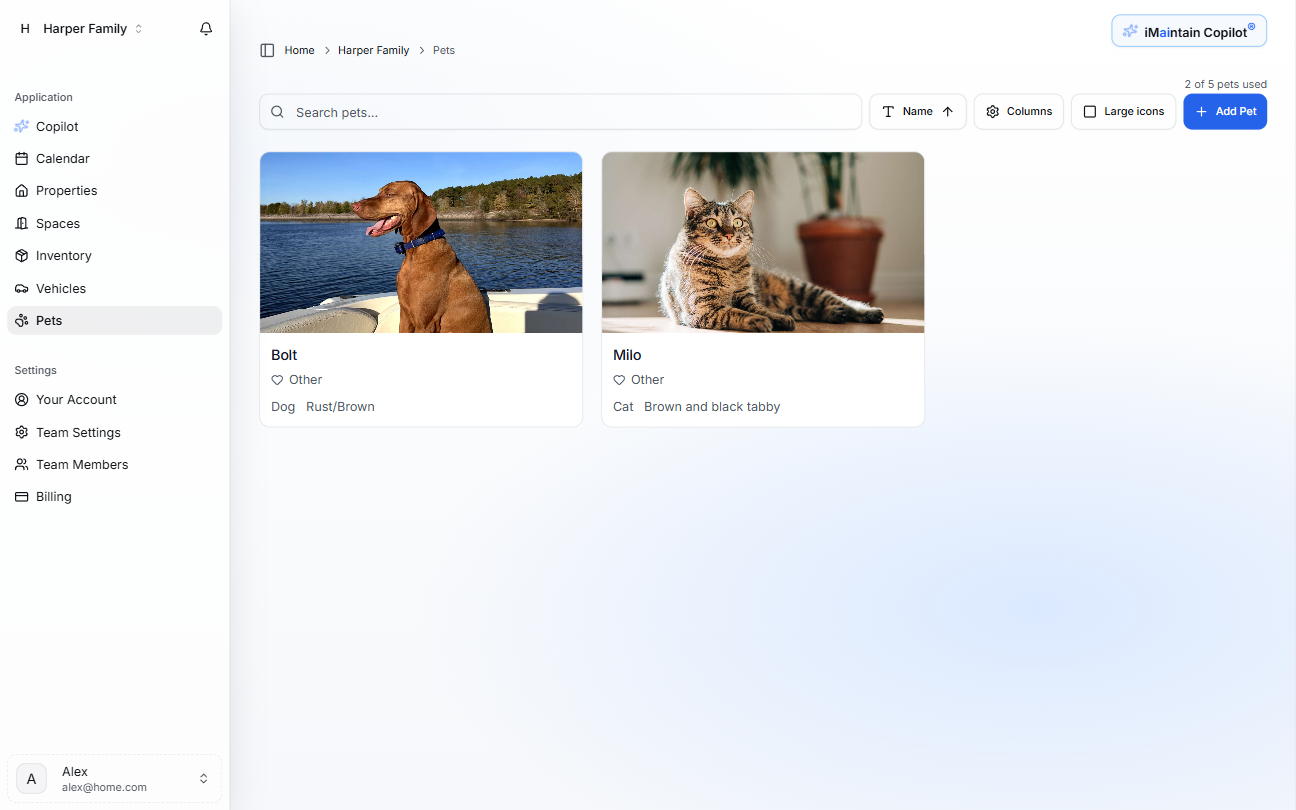Track maintenance, service history, documents, and reminders for your home, vehicles, pets, and belongings.