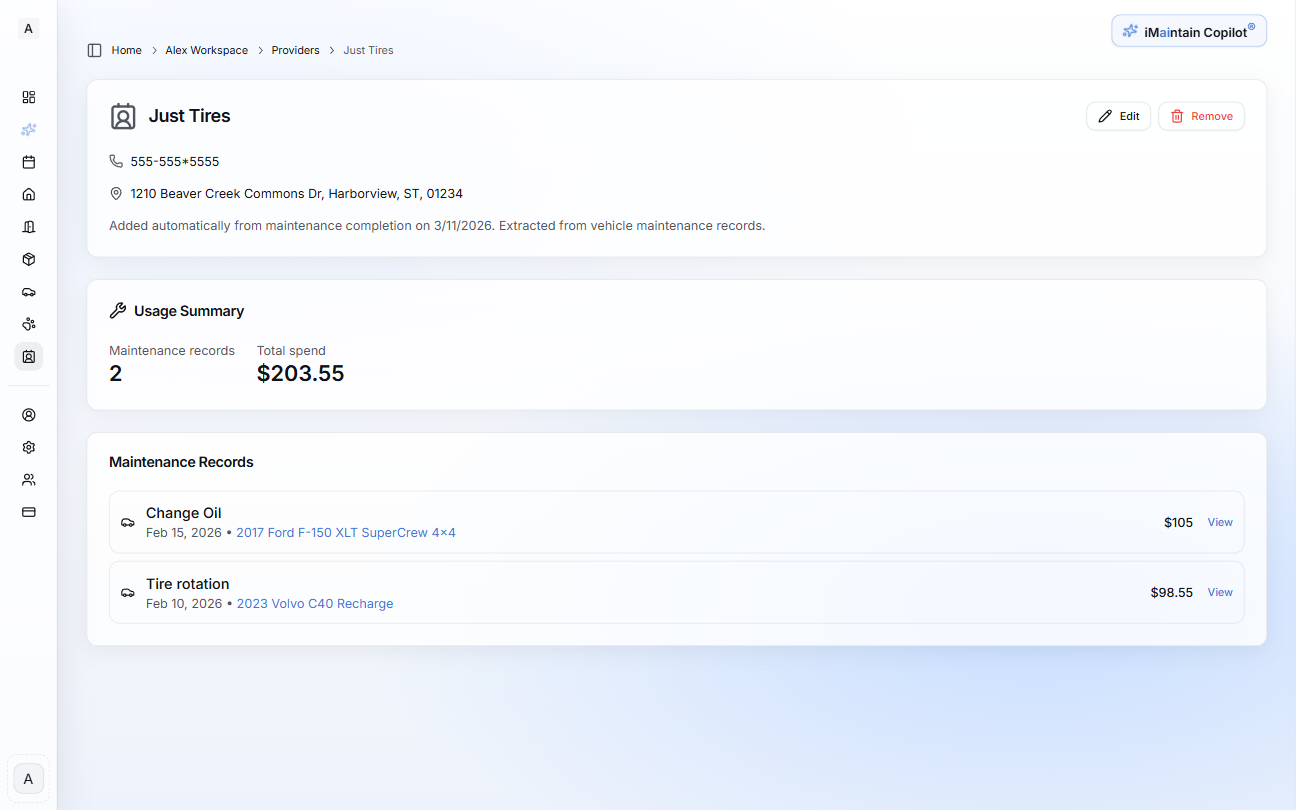 iMaintain helps you remember the service providers that maintain your home, vehicles, pets, and belongings. Every maintenance record can include the provider who performed the work.